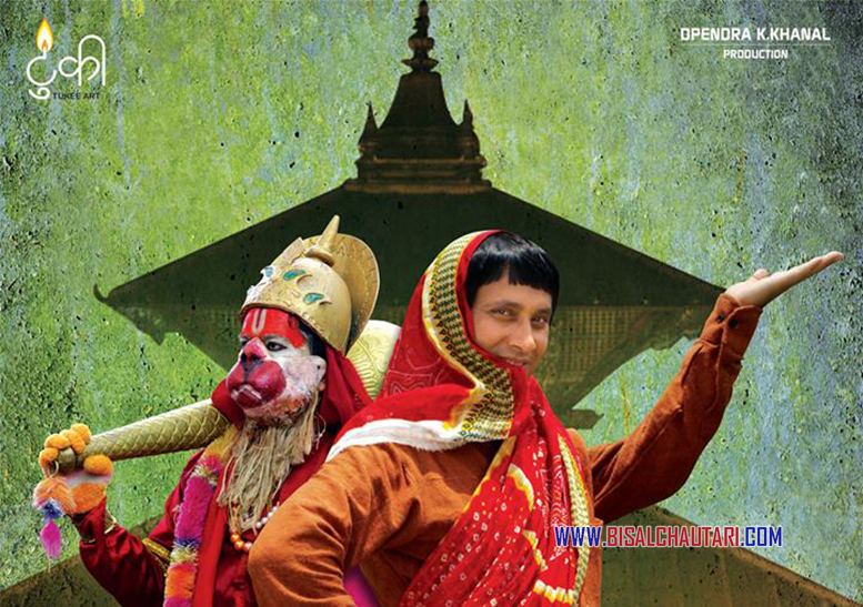 सर्ट माथि सारीको सप्कोले बेरिएको रूपमा खगेन्द्र प्रस्तुत भएका छन् । उनी आधा महिला र आधा पुरूषको भेषमा छन् । पोस्टरमा हनुमान अवतारमा अर्को एक पात्रलाई पनि देखाइएको प्रस्तुत गरिएको छ ।