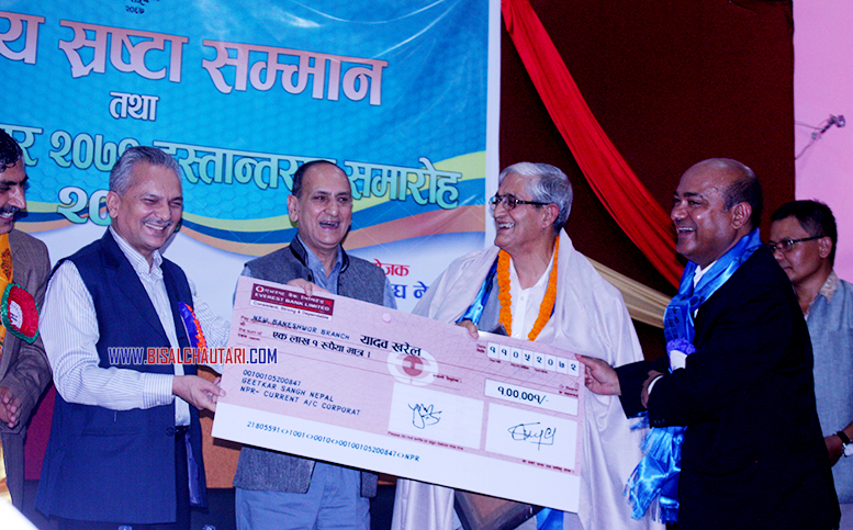 काठमाडौ, २०७२ भाद्र १२ शनिबार । चलचित्र लेखक एवं वरिष्ठ गीतकार यादव खरेल ‘स्रष्टा सम्मान–२०७१’द्वारा सम्मानीत भएका छन् । गीतकार संघ नेपालद्वारा शुक्रबार राजधानीमा आयोजित ‘स्रष्टा सम्मान तथा वर्ष गीत पुरस्कार’ कार्यक्रममा खरेललाई १ लाख एक रुपैयासहित सम्मान प्रदान गरिएको हो । कार्यक्रमका प्रमुख अतिथि नेकपा एमाओवादीका बरिष्ठ नेता पूर्वप्रधानमन्त्री डा. बाबुराम भट्टराईले सम्मान प्रदान गरेका थिए ।
