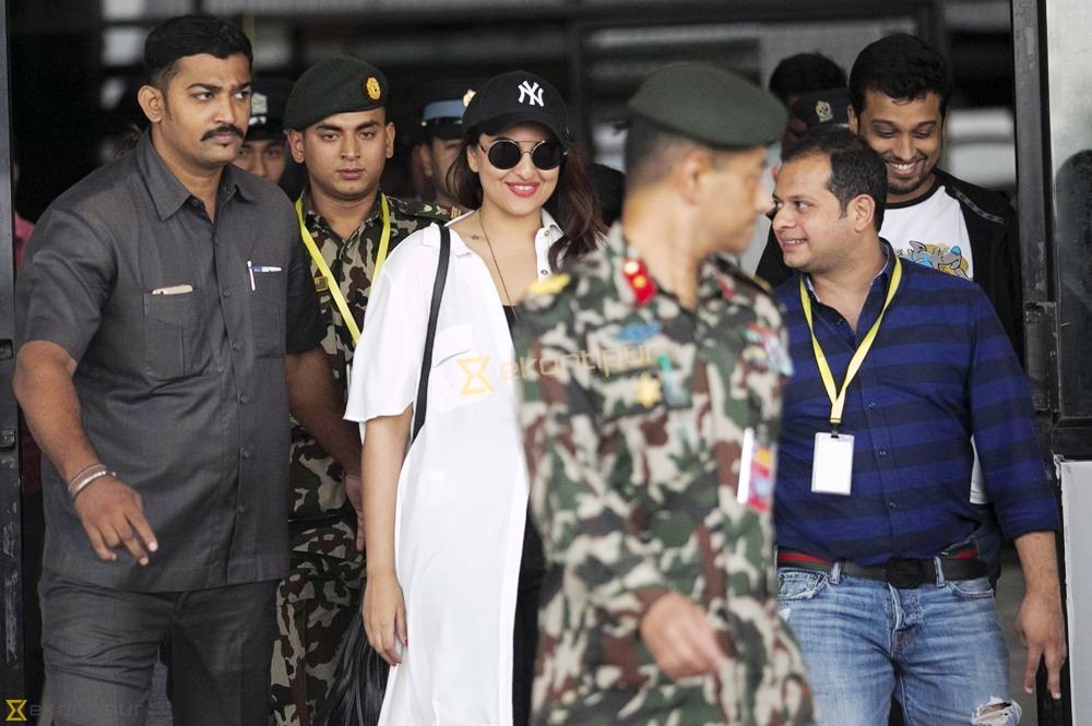 सोनाक्षी आउने समय आयोजकले सार्वजनिक गर्न नचाहेका कारण एयरपोर्टमा उनका फ्यानहरु जम्मा हुन सकेनन् । मिडियाको उपस्थिती पनि न्यून थियो । क्यापमा कालो चश्मा लगाएर स्पोर्टी ‘लुक्स’मा त्रिभुवन विमानस्थलबाट सोनाक्षी बाहिरिएकी थिइन् । उनलाई आयोजकले सोल्टी होटलमा लगेको छ । उनले चार घन्टाअघि मात्रै आफू काठमाडौं आउन लागेको भन्दै ट्वीटमा लेखेकी थिइन् ‘लेट्स डान्स’ ।