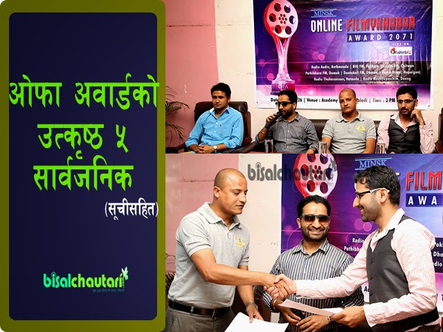 फिल्मीखबर अवार्ड (ओफा) २०७१को दोस्रो संस्करणको मनोनयन सार्वजनिक गरिएको छ । मंगलबार राजधानीमा एक कार्यक्रमको आयोजना गरी गरि उत्कृष्ट ५ मा पर्न सफल पपुलर चलचित्र तथा चलचित्रकर्मीहरुको नामावली सार्वजनिक गरिएको थियो ।