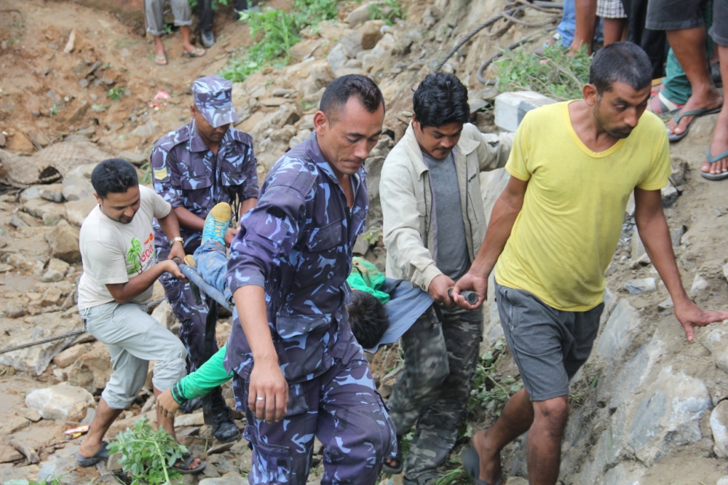 पृथ्वी राजमार्ग अन्तर्गत धादिङको थाक्रे –१ जुगेखोलामा भएको बस दुर्घटनामा उद्धार गर्दै प्रहरी र स्थानीयबासी । दुर्घटनामा परी तीन जनाको घटनास्थलमै मृत्यु भएको छ । तस्विर : विशाल चौतारी डटकम |