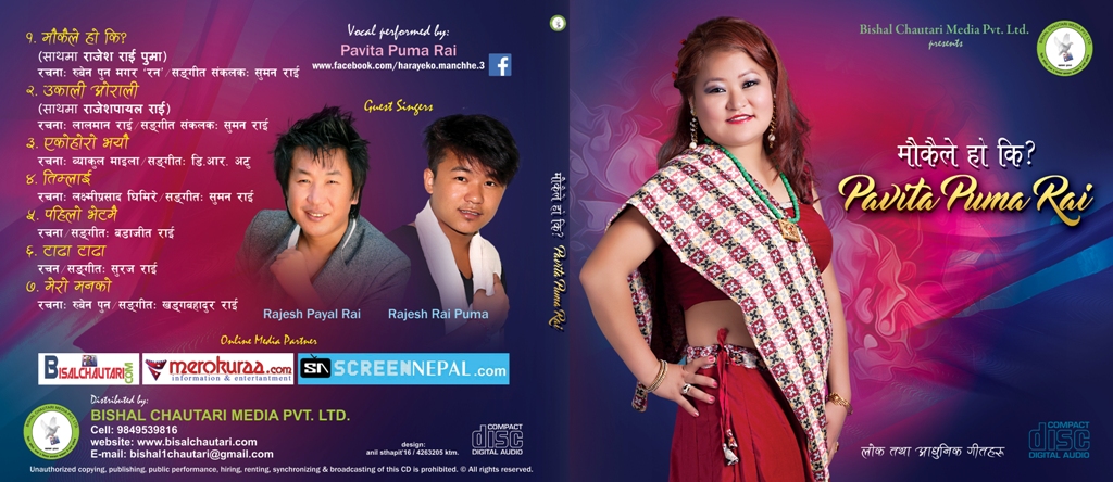 pavita-puma-rai-second-album-maukai-le-ho-ki७ गीत समावेश रहने एल्बम ‘विशाल चौतारी मिडिया प्रा.लीबाट बजारमा आउँदैछ । चाँडै बजारमा आउन लागेको एल्बम भब्य विमोचनपछि बजारमा आउनेछ । यस एल्बमको डोएट गीतमा गायिका पवितालाई चर्चित गायक राजेश पायल राई र युवा गायक राजेश राई पुमाले साथ दिएका छन् । एल्बमको टाइटल गीतमा राजेश राई पुमाले स्वरमा साथ दिएका छन्, भने रुवेन पुन मगर ‘रन’को शब्द तथा सुमन राईको संगीत रहेको छ । त्यस्तै ‘उकाली ओराली’ बोलको गीतमा राजेश पायलले स्वरमा साथ दिएका छन्, भने लालमान राईको शब्द तथा सुमन राईकै संगीत रहेको छ ।