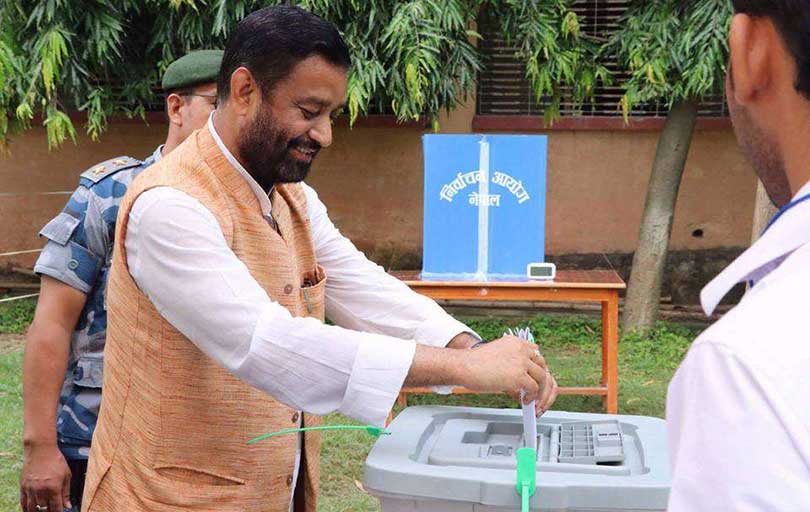 स्वाथ्यमन्त्री गिरिराजमणि पोखरेललेले बर्दिबास नगरपालिका–३, गौरीडाँडा मतदान केन्द्रबाट भोट खसालेका छन्।