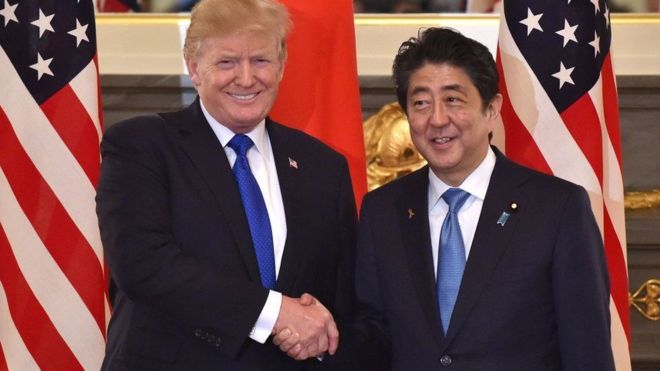 एसियाका पाँच देशको भ्रमणमा रहेका ट्रम्पले आफ्नो भ्रमणको दोस्रो दिन, सोमबार, जापानको राजधानी टोकियोमा आयोजित संयुक्त पत्रकार सम्मेलनमा बोल्दै प्योङयाङलाई लिएर उनकै शब्दमा रणनीतिक धैर्यताको युगको अन्त्य भएको बताए। जापानी प्रधानमन्त्री आबेले सबै विकल्पहरु खुला रहेको तथा कुनै पनि अन्तर्रा्ष्ट्रिय कारबाहीको जापान र अमेरिकाले नेतृत्व प्रदान गर्ने बताए। दुवै नेताले आफ्नो साझेदारीको शक्तिबारे खुलेर प्रशंसा गरेका थिए।