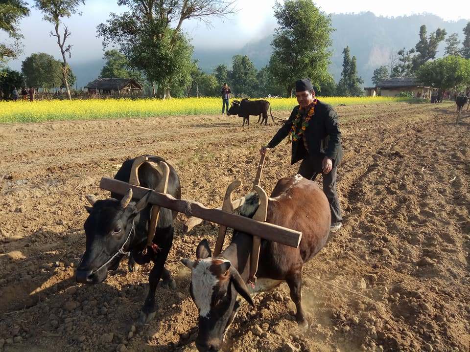 सुर्खेत,२०७४ कात्तिक २६ आइतवार । सुर्खेत चौकुने गाउँपालिका–३ सोभानचौरमा प्रतिनिधिसभाका उम्मेदवार नवराज रावत मतदाता भेट्न खेतमै पुगे । र खेत जोतिरहेका मतदातालाई भोट मागेर फकाउँदै गोरु आफैंले जोते । त्यो देखेर स्थानीय मतदाता हर्षित बने ।