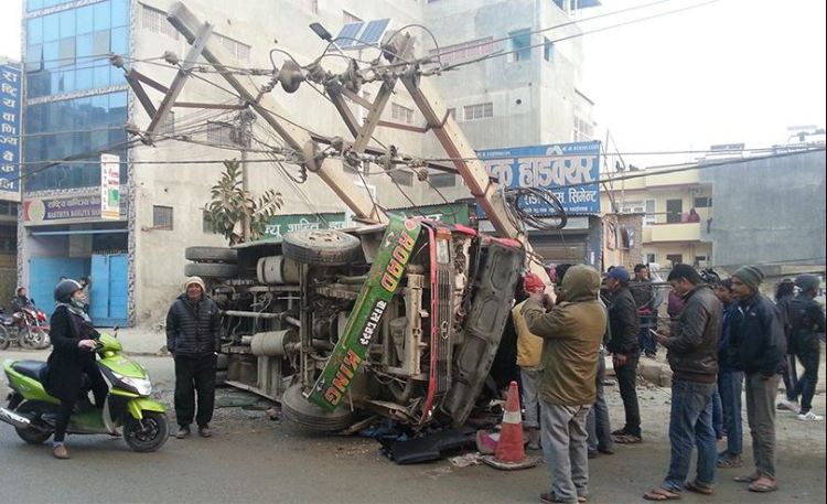 बिहान सवा ३ बजे पुरानो बानेश्वरबाट मैतिदेवीतर्फ आउँदै गरेको सो बस पोलमा ठोक्किएर पल्टिएको थियो । दुर्घटनामा घाइते ८ जनाको नर्भिक अस्पताल थापाथलीमा उपचार भइरहेको छ । ती मध्ये ४ जनाको अवस्था भने गम्भीर रहेको प्रहरीले जनाएको छ । घाइतेहरु कालिमाटीबाट तरकारी लिएर जाँदै थिए । घटनापछि चालक भने फरार रहेको अनामनगर प्रहरी वृत्तले जानकारी दिएको छ ।
