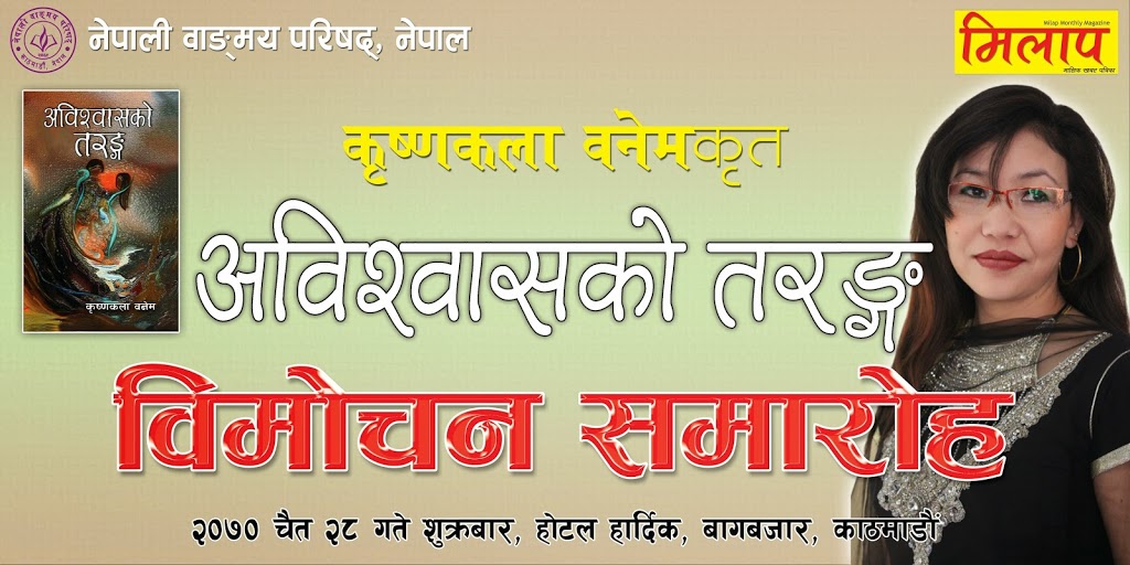 कठमाडौं, २८ चैत । इजरायल प्रवासी साहित्यकार कृष्णकला वनेमकृत अविश्वासको ‘तरङ्ग’ नामक पुस्तक केही दिन अगाडी काठमाडौंमा एक कार्यक्रमबीच विमोचित भएको छ । नेपाल प्रज्ञा प्रतिष्ठानका निवर्तमान कुलपति एवम् आयमेली कवि श्रद्धेय श्री बैरागी काइालाज्यूको प्रमुख आतिथ्यमा विमोचित भएको उक्त कृति माथि बानेश्वर क्याम्पसका डा। विष्णु राई, कवि प्राज्ञ श्रवण मुकारुङ, अन्तर्राष्ट्रिय नेपाली साहित्य समाजका वरिष्ठ उपाध्यक्ष राधेश्याम लेकाली, नेपाली वाङ्मय परिषदका अध्यक्ष शशि लुमुम्वु, मिलाप मासिकका प्रधानसम्पादक कृष्णप्रसाद भुसाल लगायतले विमोचन गरेका थिए ।