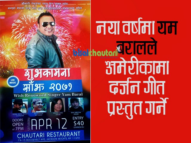 केही समय अगाडी चर्चित गायक यम बराल नेपाल आएर नमस्ते ब्याण्ड लगायतको विभिन्न साङ्गीतिक कन्र्सटहरुमा भव्य पर्फमेन्स दिएर गएका थिए । अमेरीकमा ‘शुभकामना साझ–२०७१’ नामक लाईभ कन्र्सट अमेरीकामा रहेको चौतारी रेस्टुरेन्टमा हुने भएको छ । लाइभ कन्र्सटको बारेमा कुराकानि गर्दै गायक बरालले भने–‘जहाँ गएपनि मलाई नेपाली गीत संगीतले यो स्थानमा पुर्याएको कारणले मैले नेपाली गीत संगीतलाई माया गरिरहनु पर्छ भन्ने लाग्छ । र म जहा रहेपनि नेपाली गीत संगीतलाई माया गरिरहने छु, गायक बरालले बताए ।’ त्यस्तै गायक बरालले नयाँ वर्षको सम्पुर्ण नेपालीहरुलाई शुभकामना दिदै नेपाली नयाँ वर्षलाई सबै नेपालीहरुले स्वागत गर्न अनुरोध समेत गरे ।