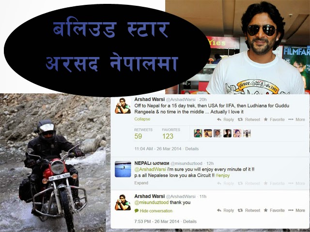 यस्तै क्रममा केही दिन अगाडी मात्र नेपाल आएकी पोर्न स्टार बलिउड अभिनेत्री सन्नी लियोनी नेपाल आएर फर्किइको केही दिन वित्न नपाउदै अर्का बलिउड अभिनेता अरसद वारसी नेपाल आएका छन् । उनले नेपाल आउन अघि आफ्नो ट्वीटर मार्फत नेपाल हिडेको औपचारीक रुपमा लेखेका थिए । अभिनेता अरसद नेपालमा बिदा मनाउने क्रममा ट्रेकिङमा रमाउने उनले लेखेका छन् । उनले ट्वीटरमा जानकारी दिन अनुसार १५ दिन नेपालमा रहनेछन् । नेपालबाट फर्के लगतै उनी आइफा अवार्डका लागि अमेरिका पुग्ने उनले आफ्नो ट्वीटरमा लेखेका छन् ।