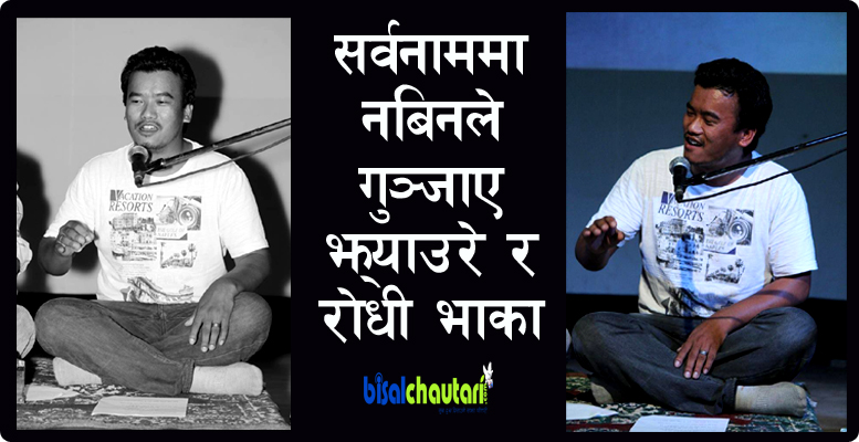 काठमाडौं, २०७१ जेठ २४ शनिवार । बिहिबार साँझ सर्वनाम थिएटरमा फोटो पत्रकार तथा गायक नबिन गुरुङले झ्याउरे र रोधी भाका गुञ्जाएका छन् । सर्वनामको हल भरि रहेको दर्शकहरुलाई फोटो पत्रकार तथा गायक नबिनले सिटमा उठेर तालि बजारउन बाध्य बनाए ।