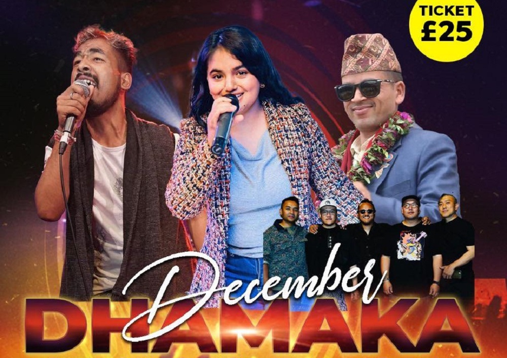 काठमाडौं, २०८० मंसिर ११ सोमवार । नेपाल आइडल सिजन २ बाट सर्वाधिक चर्चामा आए गायक पवन गिरी र नेपाल आइडल सिजन ३ की बिजेता, गायिका सज्जा चौलागाईंले बेलायतमा प्रस्तुतिमा दिने भएका छन् । आगामी डिसेम्बर ९ तारिख शनिबार साँझ एम्पायर ब्यान्केटिङ अल्डरसटमा ‘डिसेम्बर धमाका’ हुने भएको हो ।