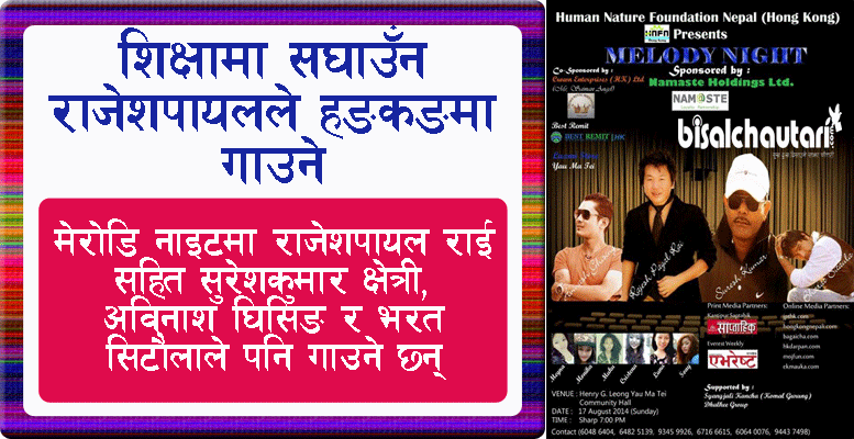 काठमाडौं, २०७१, असार २७, शुक्रबार । नेपालमा रहेका गरिब बालबालिकालाई शिक्षा प्रदान गर्न आर्थिक सहयोग जुटाउने उद्देश्यले हङकङमा आगामी भदौ १ गते ‘मेलोडी नाइट’ नामक सांगीतिक कार्यक्रम हुने भएको छ । गरिब बालबालिकाहरुलाई विभिन्न कार्यक्रम गरी शैक्षिक सहयोगमा टेवा पुर्याउन स्थापना गरिएको ह्युमन नेचर फाउण्डेसन नेपाल, हङकङले उक्त कार्यक्रम आयोजना गर्न लागेको हो ।