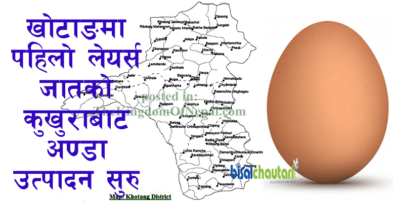 खोटाङ, २०७१, श्रावन, २१ बुधवार । जिल्लामै पहिलो पटक अण्डा उत्पादन शुरु भएको छ । सदरमुकाम दिक्तेलस्थित कालिका कृषि सहकारी संस्था लिमिटेडले जिल्लामै पहिलो लेयर्स जातको कुखुराबाट अण्डा उत्पादन सुरु गरेको हो ।