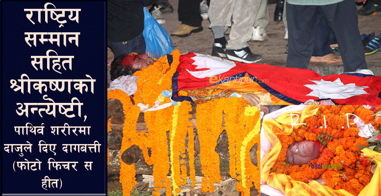 काठमाडौं, २०७१, श्रावन, २६ सोमबार । ४७ वर्षीय लोकप्रिय अभिनेता श्रीकृष्ण श्रेष्ठको अन्त्येष्टी पशुपति आर्यघाटमा राष्ट्रिय सम्मानका साथ गरिएको छ । अभिनेता श्रेष्ठको शवमा सञ्चारमन्त्री मिनेन्द्र रिजालले राष्ट्रिय झण्डा ओढाएर सम्मान व्यक्त गरे । नेपाल प्रहरीले अभिनेता श्रेष्ठलाई सम्मानस्वरुप अन्तिम सलामी अर्पण गरेको थियो । अभिनेता श्रीकृष्णको शरीरमा दाजुले दागबत्ती दिएका थिए ।