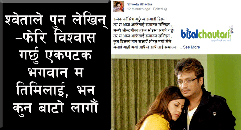 काठमाडौँ, २०७१, भाद्र १७ मंगलबार । स्वर्गीय लोकप्रिय अभिनेता श्री कृष्ण श्रेष्ठको निधनपछि विक्षिप्त बनेकी अभिनेत्री तथा अभिनेता श्रेष्ठको श्रीमती श्वेता खड्काले फेसबुकमार्फत् भगवानसँग गुनासो पोखेरहेकी छिन् । उनले दोस्रो चोटी भगवान्लाई गुनासो पोखेकी छिन् । श्रीमाण श्रीकृष्णको मृत्युसँगै मुछिर्त अबस्थामा रहेरहेकी अभिनेत्री श्वेताले दोस्रो पटकको आफ्ना भावनामा भगवान्संग एकचोटी फेरी विश्वास गर्दै लखेकी छिन्–‘फेरि विश्वास गर्छु एकपटक भगवान म तिमिलाई मलाई गार्हो भयो आफैले आफैंलाई समाल्न, लौ अब तिमि आफैं भन म कुन बाटो लागौं, मलाई गाह्रो भयो आफैले आफैंलाई समाल्न’ अभिनेत्री श्वेताले लेखेकी छिन् ।