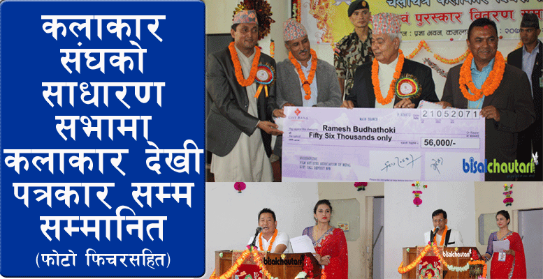 काठमाडौ, २०७१, भाद्र २१ शनिबार । नेपाल चलचित्र कलाकार संघले आफ्नो १३ औं बार्षिक साधारणसभाको अवसरमा विभिन्न कलाकर्मीदेखी पत्रकार सम्मलाई सम्मान गरेको छ । सम्मनित हुनेहरुमा नेपाल चलचित्र कलाकार संघ राष्ट्रिय पुरस्कारबाट निर्देशक तथा कलाकार रमेश वुढाथोकीलाई ५६ हजार नगदसहित पुरस्कृत गरिएको छ । ‘नेपाल चलचित्र कलाकार संघ शान्ति मास्के पुरस्कारबाट कलाकार भीम बहादुर थापालाई नगद २१ हजारसहित पुरस्कृत गरिएको थियो ।