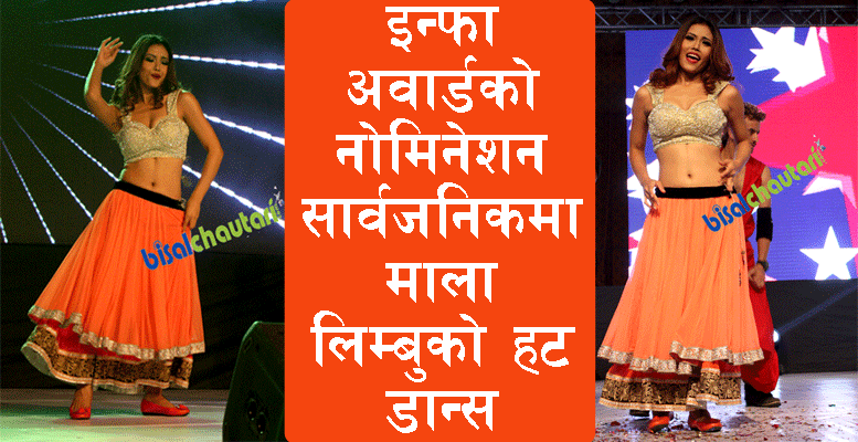 काठमाडौं, २०७१, असोज ३० बिहीवार । आधा दर्जन भन्दा बढी म्युजिक भिडियो तथा गुडबाई काठमाडौ र वान वे चलचित्रमा अभिनय गरिसकेकी अभिनेत्री माला लिम्बुले इन्फा अवार्डको टप ५ नोमिनेशन सार्वजनिक कार्यक्रममा हट डान्स प्रस्तुत गरेकी छिन् ।