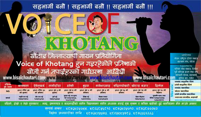 काठमाडौं, २०७१, मंसिर १७ बुधबार । ‘समतामुलक समाज निर्माणका लागि सांगीतिक अभियान’ भन्ने नाराका साथ खोटाङमा जिल्लाव्यापी गायन प्रतियोगीता ‘भ्वइस अफ खोटाङ’ हुने भएको छ । voice of khotang singing competition