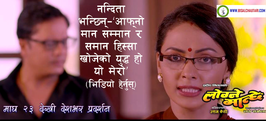 काठमाडौ, २०७१, पौष १८, शुक्रबार । अभिनेत्री नन्दिता केसीले एक भिडियोमा –‘आफ्नो मान सम्मान र समान हिस्सा खोजेको युद्ध हो यो मेरो’ बताएकी छिन् । तर यो भिडियो पूर्ण रुपमा पारिवारिक प्रेमकथामा बनेको चलचित्र ‘लोग्ने मान्छे’को सार्वजनिक प्रोमोको हो । Nandita KC movie Logne Manchhe
