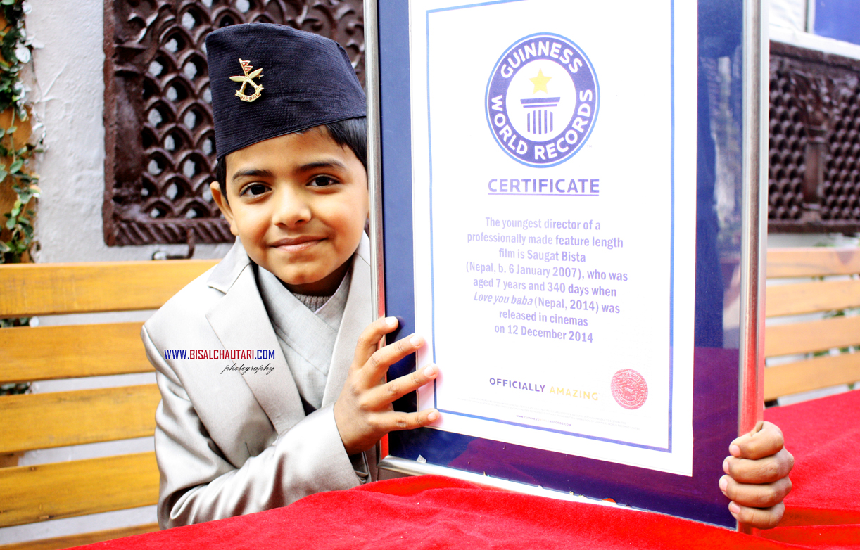 Saugat, who is just 8 year old, is a very active child. Even in school, he is very forward possesses high academic excellence with good sense of humour. He is outstanding in almost every extracurricular activity in school. Saugat has a very filmy family background. His father Gajit Bista is a renowned actor, Sangam his elder sister is also a famous child artist. So, acting and movie is all over his body as blood because of the family background too. He, first, debuted through the small Television advertisement of “marigold cooking oil’ when he was just five year old. At that tender age to, his talent was spotted by a makeup artist and he was given opportunity to act as a lead role in the movie ‘Ka kha Ra’ his immense acting skill in the documentary movie was again realized by the Director  Mr. Mohan Niraula full lunched/offered him for to act as a child artist in the feature film “Janmabhumi” though, direction is a new field for him but Kollywood is not a new sector for him. Even before directing this movie ‘love you baba’ Saugat attended many workshop to gain the perfection as a director he took special classes from Nawal Nepal who is the director of the hit movie “Lazza”. Apart from him, he learnt from Mr. Dibyaraj Subedi, Gajit Bista, Gamvir Bista. So, Saugat Bista has tried his level best to prove himself as the youngest director for “Guinness book of World Records” and now he succeeded to become Guinness world record holders as world youngest film director and also as one of the challenging child (young director) in Kollywood. Not only that, he has also become a role model for many young children at this age in the journey of establishing himself as the valuable citizen of the country.  Saugat Bista is studying on a second grade at Suryodaya Jyoti Secondary School in Dillibazaar, Kathmandu, Nepal.