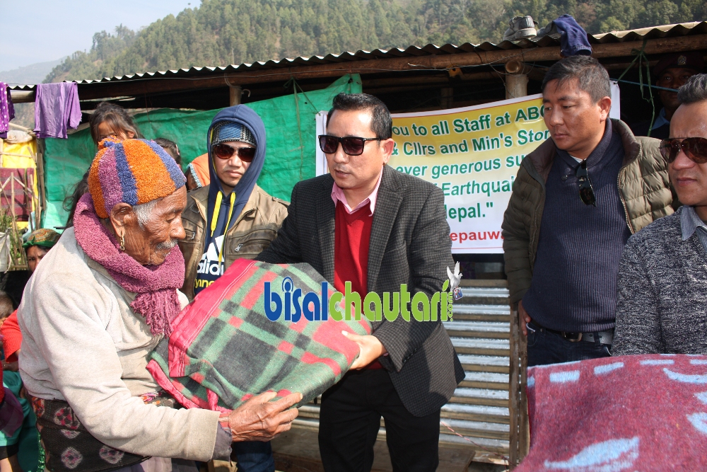 काठमाडौ, २०७२ पौष ३० बिहिबार । गत बैशाखमा गएको भुकम्प पीडितहरु बढ्दो जाडोका कारण जनजिवन कस्टकार बन्दै गइरहेको बेलामा ‘हेल्पिङ यु’ युकेले रसुवा जिल्ला लहरेपौवा गा.बि.स को नौबिसेमा भुकम्प पीडितहरुलाई न्यानो कपडा वितरण गरेको छ । भुकम्प पीडितहरुलाई न्यानो कपडा नेपाल चलचित्र विकाश बोर्ड अध्यक्ष राजकुमार राईको हातबाट वितरण गरिएको थियो ।