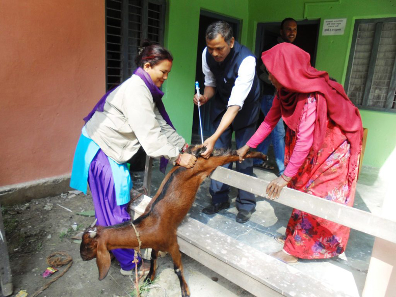 कञ्चनपुरमा बाख्राको कृत्रिम गर्भाधान गराउँदै