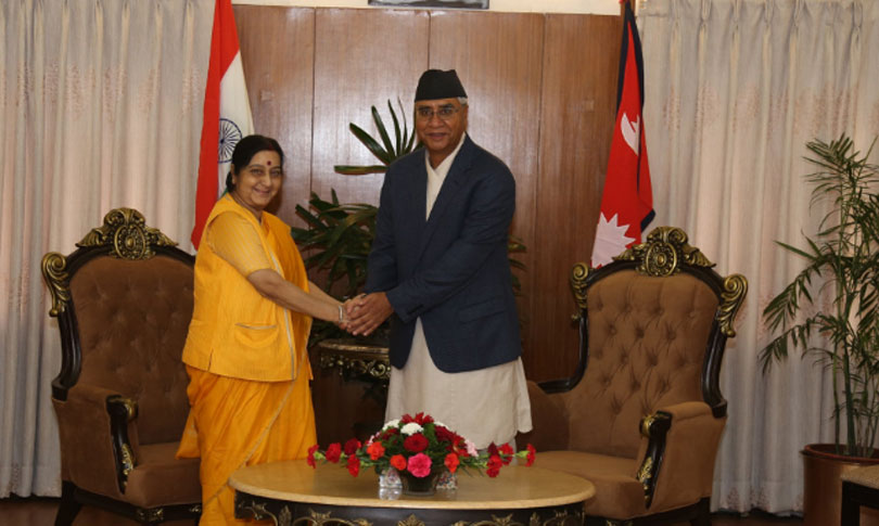 दिल्ली पुगेका प्रधामन्त्री देउवालाई, विदेशमन्त्री स्वराजद्वारा स्वागत