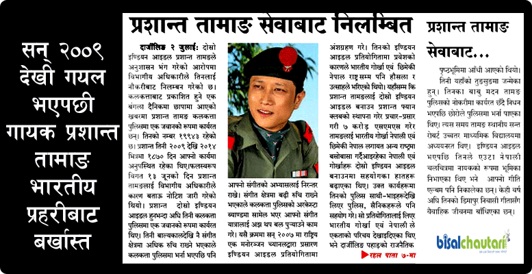 सन् २००९देखी गयल भएपछी गायक प्रशान्त तामाङ भारतीय प्रहरीबाट बर्खास्त